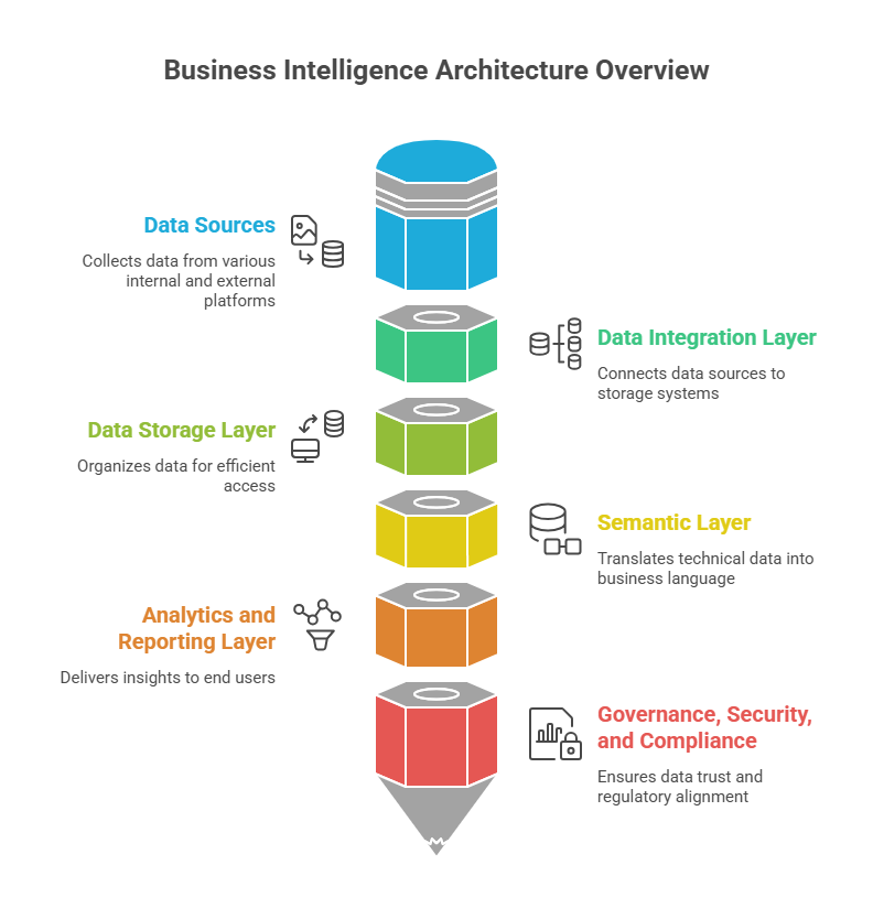 BI-based architecture relies on interconnected key components that manage data flow, integrity, and reporting. Each layer plays a distinct role in transforming raw enterprise data into trusted insights.