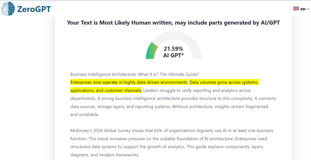 McKinsey’s 2024 Global Survey shows that 65% of enterprises regularly use AI in at least one business function. This trend increases the need for a scalable foundation of BI architecture. Enterprises need structured data systems to support the growth of analytics. This guide explains components, layers, diagrams, and modern frameworks.