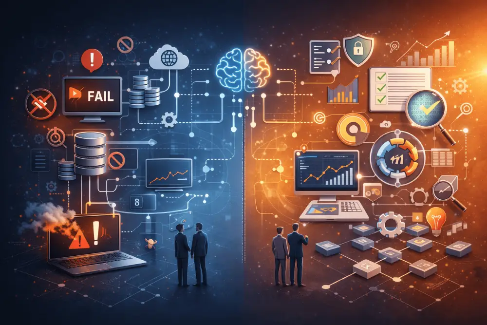 Poor governance amplifies that risk. First-time deployments often lack structured testing and monitoring. Security and compliance gaps expose organizations to penalties. Unrealistic expectations lead to executive disappointment. Without change management, user adoption remains low.